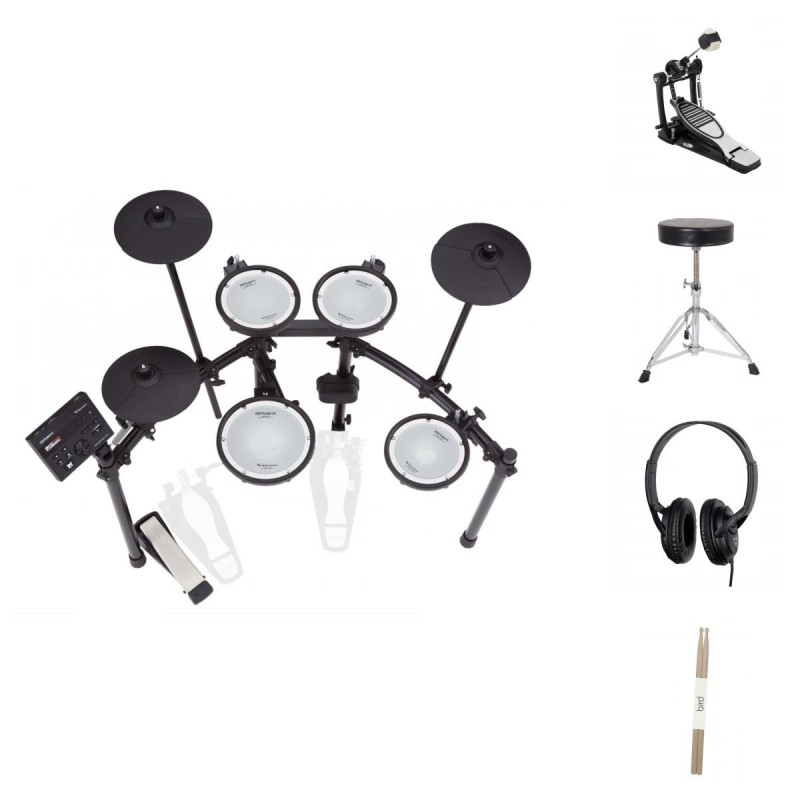 Compacte et d'un prix abordable, mais dotée d'un son, d'un toucher et de fonctions professionnels pour vous faire progresser rapidement, La batterie électronique ROLAND TD-07DMK Full Pack est le point d'entrée de la série V-Drums. Bien que les pads soient plus petits que ceux des kits de la gamme supérieure, vous apprécierez la sensation satisfaisante que procurent la caisse claire PDX-8 et des trois toms PDX-6A, tous dotés des peaux ultra-silencieuses Roland à mailles doubles. Les cymbales compactes CY-5 (crash et ride) vous permettent de jouer avec expression dans les espaces restreints, tandis qu'un kick pad monté sur pied s'associe à l'encombrement le plus réduit de la gamme TD-07 pour former un kit parfait pour la maison.