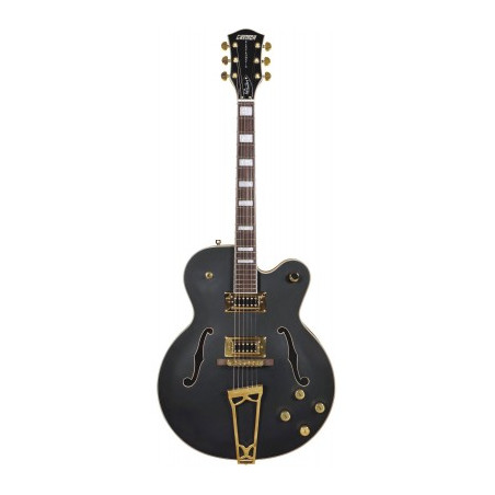 La guitare électrique GRETSCH G5191BK Tim Armstrong Signature Electromatic Flat Black porte l'empreinte personnelle du fondateur de Rancid et parrain du punk Armstrong. Une sonorité énorme résonne au plus profond de son corps creux à pan coupé lié, qui présente des barrettes parallèles avec une barre d'harmonie et des trous F liés. Le manche en érable d'une seule pièce est doté d'un sillet en graphite blanc et d'une touche en palissandre liée avec des incrustations de blocs en acrylique. Parmi les autres caractéristiques, citons les doubles micros humbucking Black Top Filter'Tron™ avec lunette plaquée or, le sélecteur de micros à trois positions, l'accastillage plaquée or, la tête liée avec incrustation Gretsch poirée et la signature d'Armstrong sur le couvercle du truss rod.