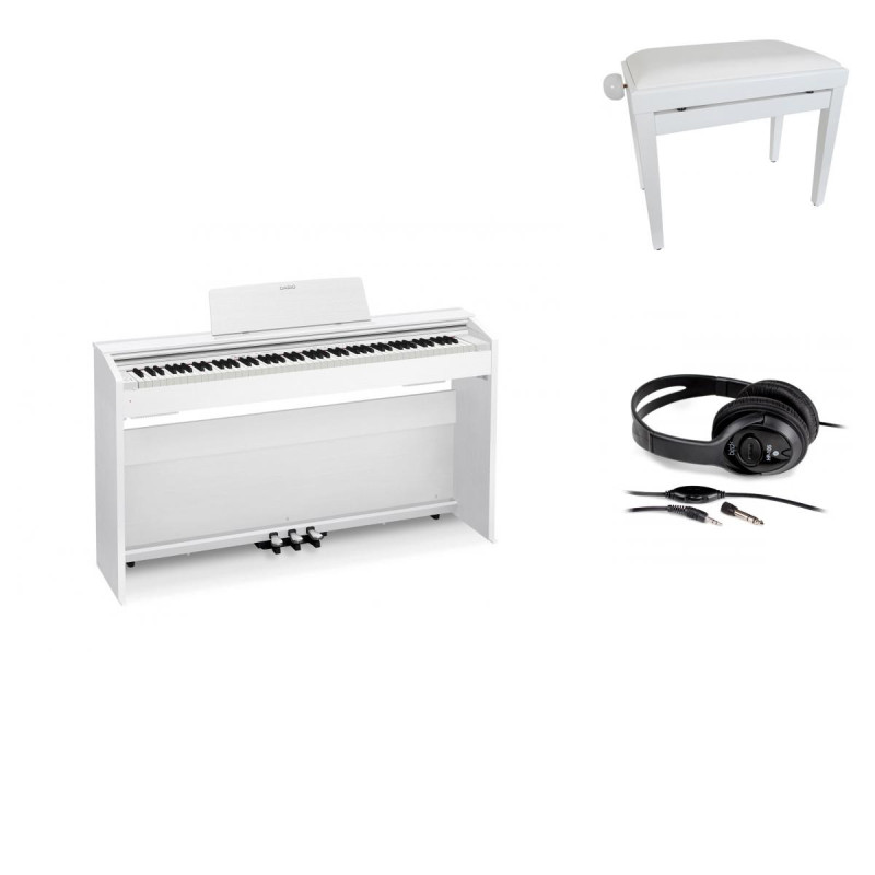 Piano numérique CASIO FULLPack Privia PX-870WE Blanc : piano livré avec Banquette, Casque, Clavier, 88 notes, Tri-sensor Scaled Hammer Action Keyboard 2, Touches en ébène et voire de synthèse, 3 niveaux de vélocité, Sonorités, Moteur audio : Multi-dimensional Morphing AiR, Polyphonie(maximum) : 256, Nombre de sonorités : 19, Simulation, Hammer Response, Damper Resonance, Damper Noise (ON / OFF), Effets numériques, Hall Simulator / Reverb 4 (Reverb), Chorus 4, Brilliance (-3 ~ 0 ~ 3), DSP, Morceaux, Concert Play 10 Morceaux, Contrôles Start / Stop, Mode Listen / Lesson / Play, Music Library 60 Morceaux, 10 morceaux User, Connexion à l'appli, Fonction leçon Part ON / OFF, Lesson Part Select Main droite, Main gauche, Enregistreur MIDI 2 morceaux, 1 piste, Mémoire 5000 notes, Duet Mode, ...