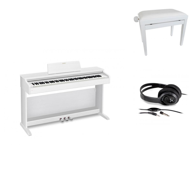 Piano numérique CASIO FULLPack Celviano AP 270 Blanc : piano livré avec Banquette, Casque, Caractéristiques techniques, Clavier, 88 notes, Tri-sensor Scaled Hammer Action Keyboard Ⅱ, Touches en ébène et ivoire de synthèse, 3 niveaux de vélocité, Sonorités, Moteur audio : Multi-dimensional Morphing AiR, Polyphonie(maximum) : 192, Nombre de sonorités : 22, Simulation, Hammer Response, Damper Resonance, Damper Noise (ON / OFF), Effets numériques, Hall Simulator / Reverb 4 (Reverb), Chorus 4, Brilliance (-3 ~ 0 ~ 3), DSP, Morceaux, Concert Play 10 Morceaux, Contrôles Start / Stop, Mode Listen / Lesson / Play, Music Library 60 Morceaux, 10 morceaux User, Connexion à l'appli, Fonction leçon Part ON / OFF, Lesson Part Select Main droite, Main gauche, Enregistreur MIDI 2 morceaux, 1 piste, ...