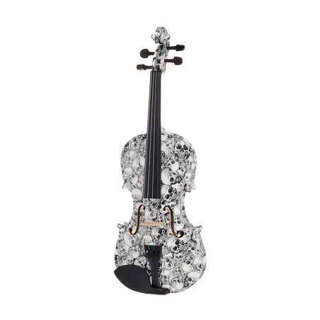 Violon THOMANN Skulls Violin Set 4/4 : Set violon 4/4. Entièrement massif. Table en épicéa massif. Fond et éclisses en érable massif. Touche en bouleau. Chevilles et mentonnière en jujubier. Cordier avec vis d'accordage fin. Finition: Motifs têtes de morts. Etui. archet et colophane inclus.